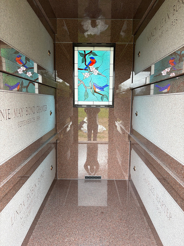 Private Mausoleum Ornamentation: Solid Bronze Double Door, Blue Bird Stained Glass Windows, Flat Roof with Cross Cap Stone, 1/2 Turned solid single piece construction fluted Doric columns.