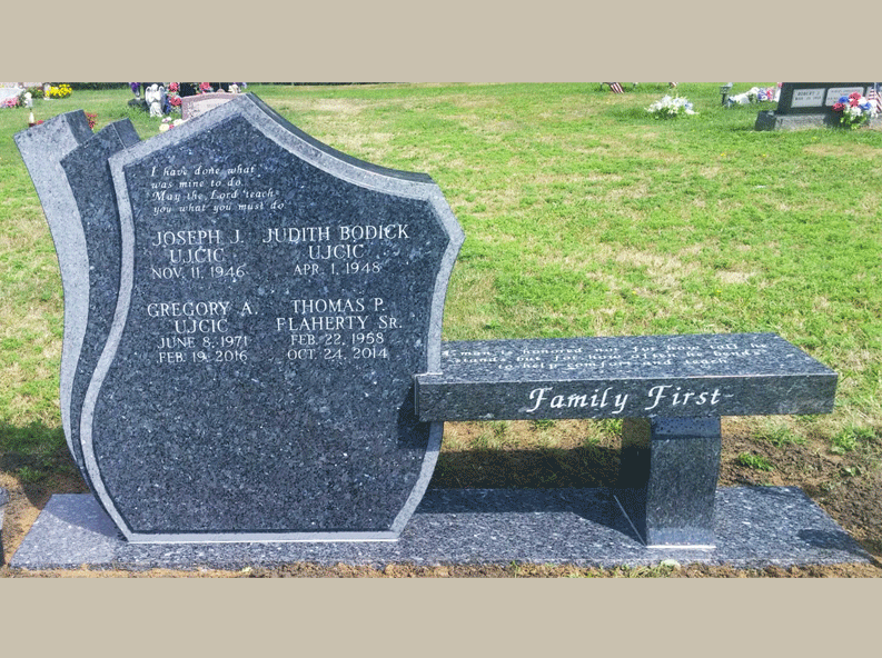 Blue pearl custom granite monument bench installed at Deer Creek Cemetery in Cheswick, PA.